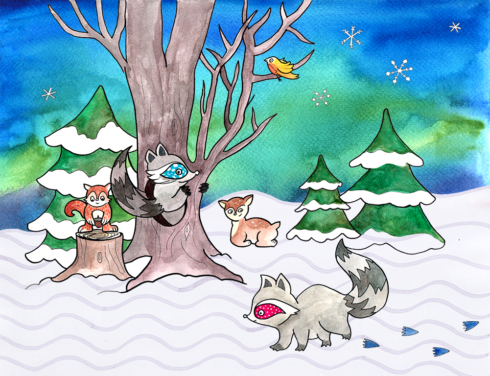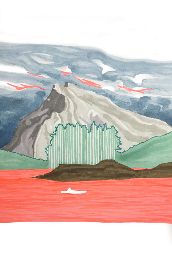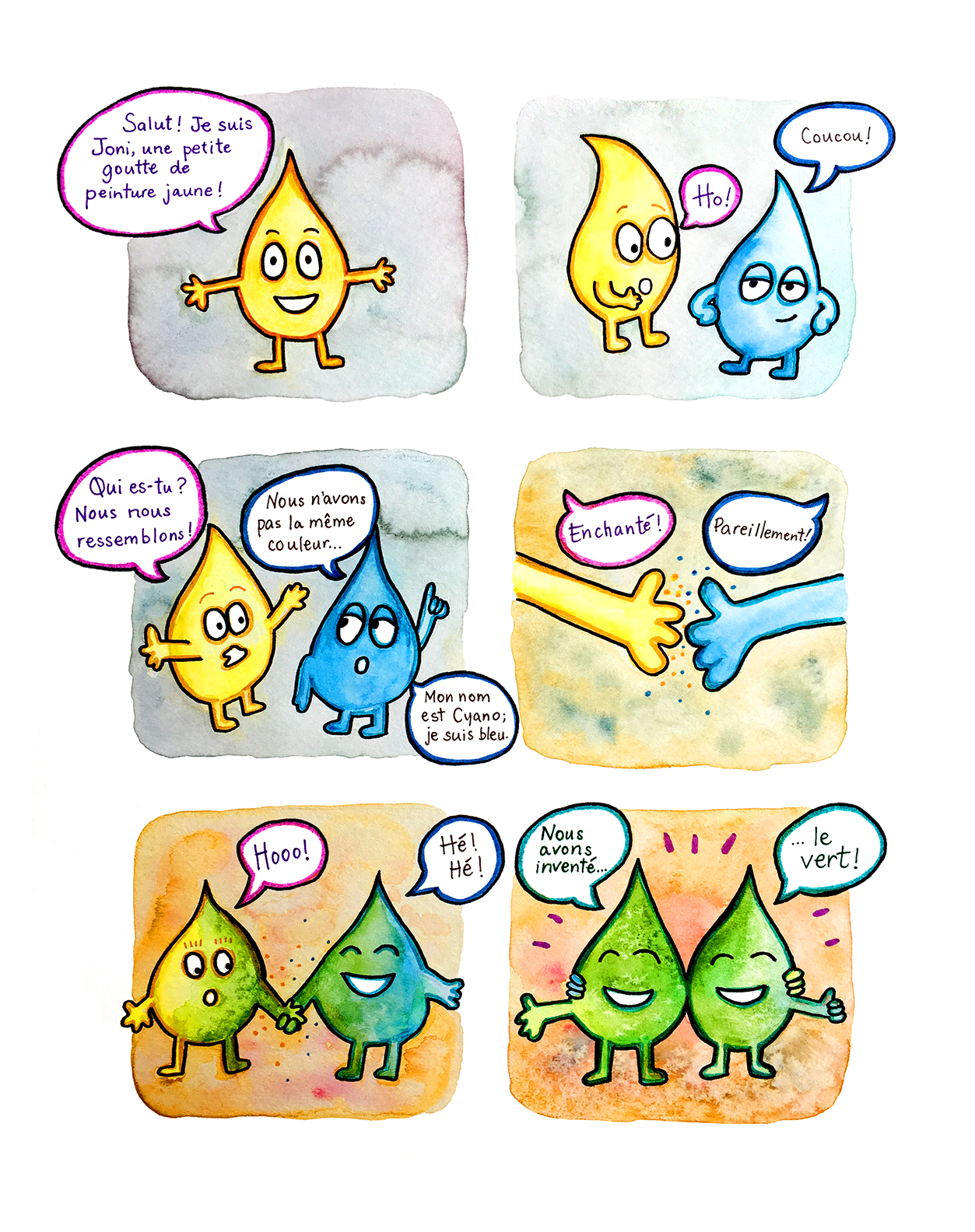 Lieu imaginaire, feutres à l’huile, 2021.Le mélange des couleurs, BD, aquarelle, 2020.Illustration pour Dumoulin bicyclettes, feutre, 2020. Double monster, acrylique, 2018.Le mélange des couleurs, détail.Illustration pour le conte Les Ratons de Dominique Loiselle, aquarelle et encre, 2019.La boîte à Marius, encre, jeu pour bébé, 2015.La boîte à Marius, détail.Légendes Inuit, illustration au pochoir à l’acrylique.