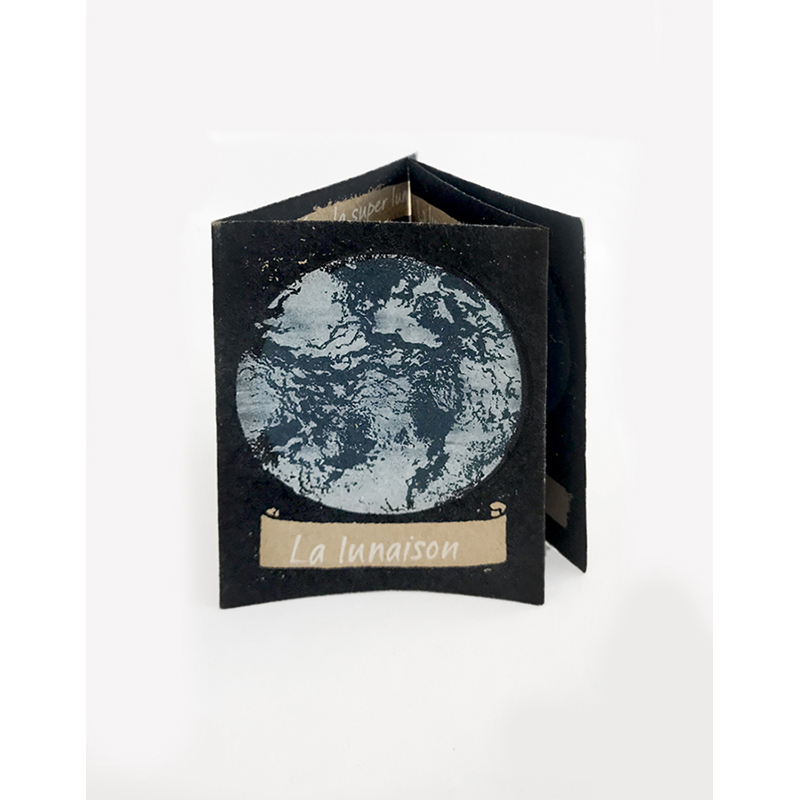 La lunaison, fanzine imprimé en sérigraphie sur papier Kraft, 2021.La lunaison, fanzine imprimé en sérigraphie sur papier Kraft, recto, 2021.La lunaison, fanzine imprimé en sérigraphie sur papier Kraft, verso, 2021.Vade mecum, livre d’artiste sur le travail de création en collaboration. Impression numérique sur papier Enviro100. 5" X 5,5", 2013-2014.Vade mecum, planches originales. Sérigraphie et médiums mixtes. Sérigraphie, encre, graphite et dactylo sur papier aquarelle. 5" X 6", 2013-2014.Vade mecum, exemples de pages (50 au total). 5" X 5,5", 2013-2014.KONTRLA HÖSS, livre d’artiste, impression numérique sur papier glacé, 6,5" X 6", 2012-2013.KONTRLA HÖSS, livre d’artiste, impression numérique sur papier glacé, 6,5" X 6", 2012-2013.KONTRLA HÖSS, détail, 2012-2013.KONTRLA HÖSS, détail, 2012-2013.Dialogue : relations à l’objet, livre d’artiste, impression numérique, 8,5" X 8,5", 2012. Publication d’artiste double sur deux processus de création lors de la résidence d’artiste utile[in]utile. Dialogue : relations à l’objet, livre d’artiste, impression numérique, 8,5" X 8,5", 2012. Publication d’artiste double sur deux processus de création lors de la résidence d’artiste utile[in]utile.Dialogue : relations à l’objet, détail. Impression numérique, 8,5" X 8,5", 2012. Publication d’artiste double sur deux processus de création lors de la résidence d’artiste utile[in]utile.Dialogue : relations à l’objet, détail. Impression numérique, 8,5" X 8,5", 2012. Publication d’artiste double sur deux processus de création lors de la résidence d’artiste utile[in]utile.